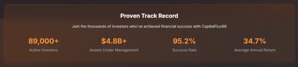 This CapitalFlux69.com Review highlights the platform’s measurable results across its investor base. CapitalFlux69 reports an average annual return of 34.7%, with 95.2% of strategies historically successful.