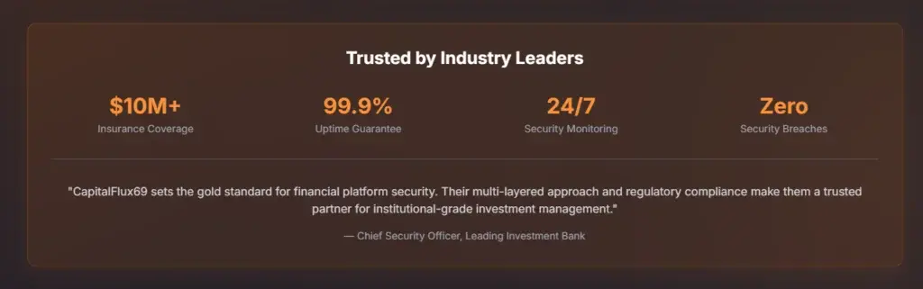 With $10 million in insurance coverage and a multi-layered security framework, investors can feel confident that their assets are protected. CapitalFlux69 prioritizes operational resilience, ensuring systems remain functional and responsive even during periods of high market volatility.