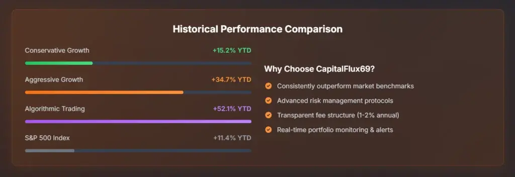 A: CapitalFlux69 offers professional-grade tools and AI-powered trading strategies, real-time risk assessments, and multi-asset access. With a 95%+ reported success rate and $4.8B in portfolio growth across 89,000+ investors, it combines advanced tech and proven strategies for a seamless experience.