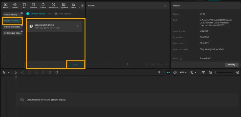 Open CapCut PC and click New Project. Then choose AI Avatar from the side panel and select Create with Photo. Upload the picture you want, and the tool will convert it into an avatar. Once the avatar is ready, it appears in your project, ready to be enhanced with voice and other edits.