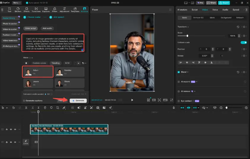 Match the avatar’s gestures and tone with the flow of your script. Adjust the voiceover on the timeline so it syncs well with your video clips. Preview the result to confirm the delivery looks natural. Overlay the avatar with backgrounds and captions to add a polished feel. This method helps create faceless content faster while maintaining quality.