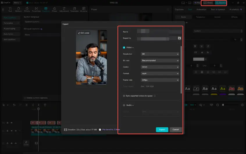 When your project is ready, click Export in the top-right corner. Choose the resolution, frame rate, and video format that you prefer. Once exported, save it on your device.